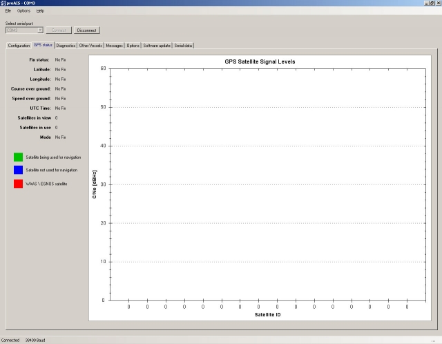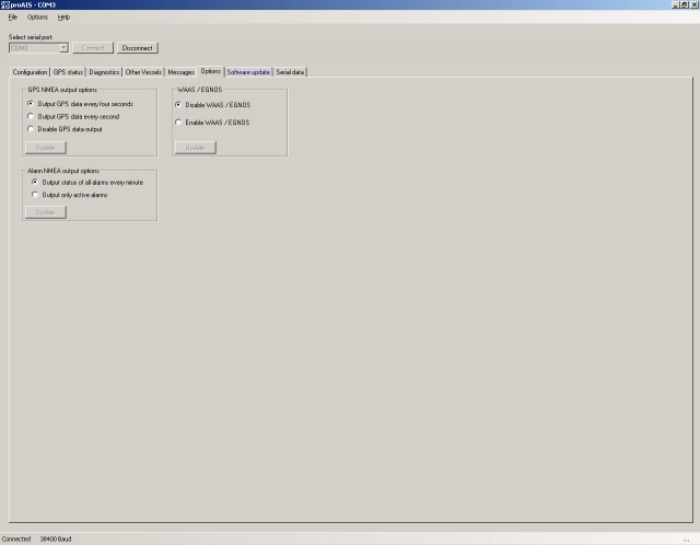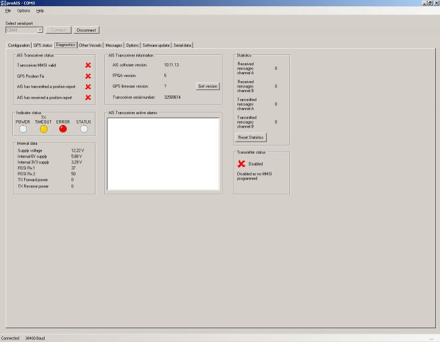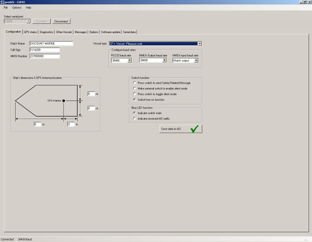 Ce premier écran permet d'indiquer le nom, l'indicatif, et le MMSI du bateau ainsi que les cotes d'emplacement de l'antenne GPS. Peu important sur une embarcation de plaisance, ces informations sont primordiales sur un bateau de bonne taille : pour prévoir d'éventuelles collisions sur un tanker de 300m, l'offset avant collision est tout de suite important.