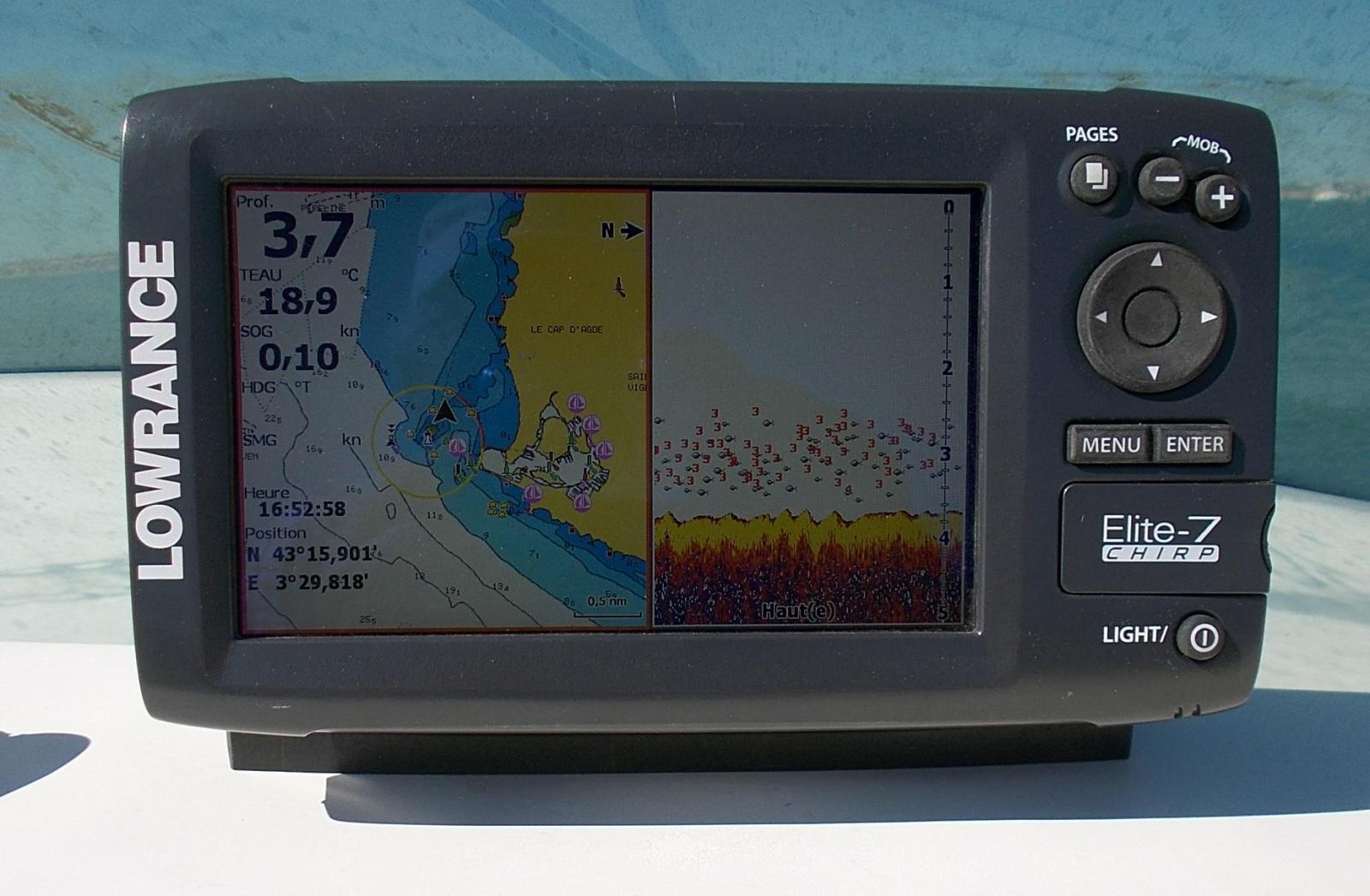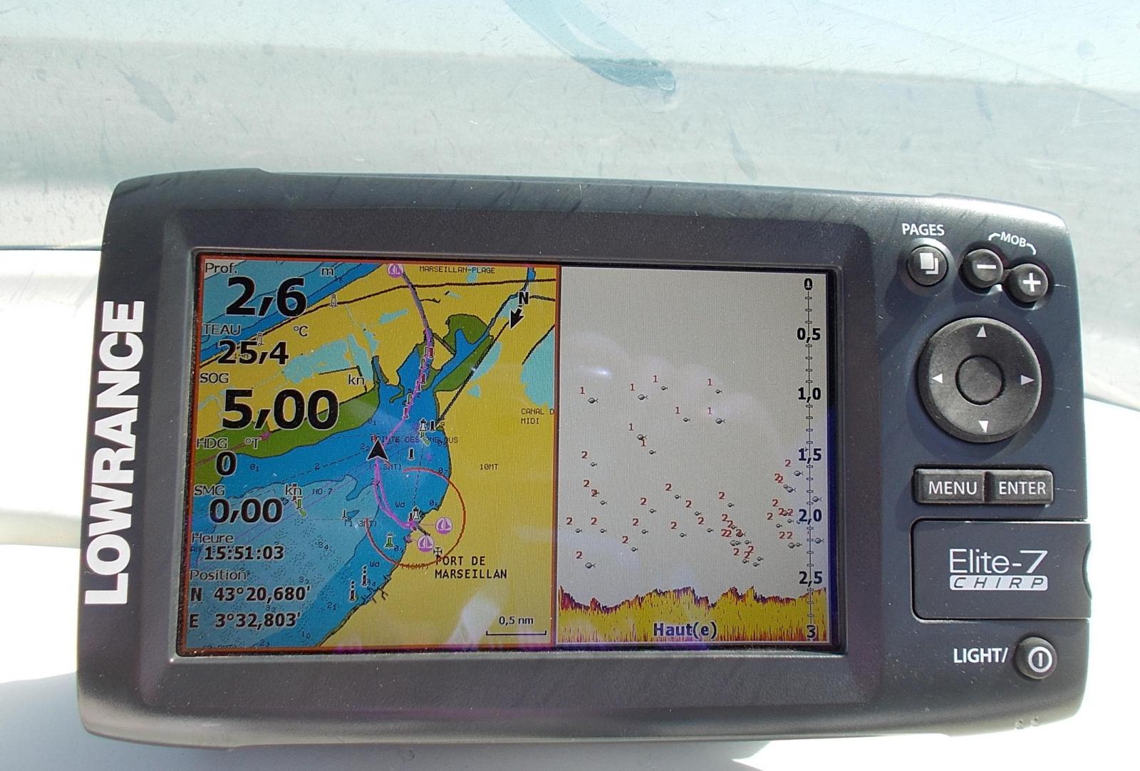 J'ai pu procéder aux essais grandeur nature de mon combiné Elite 7 shirp Lowrance acheté au dernier Nautic.