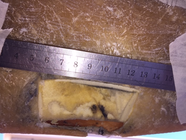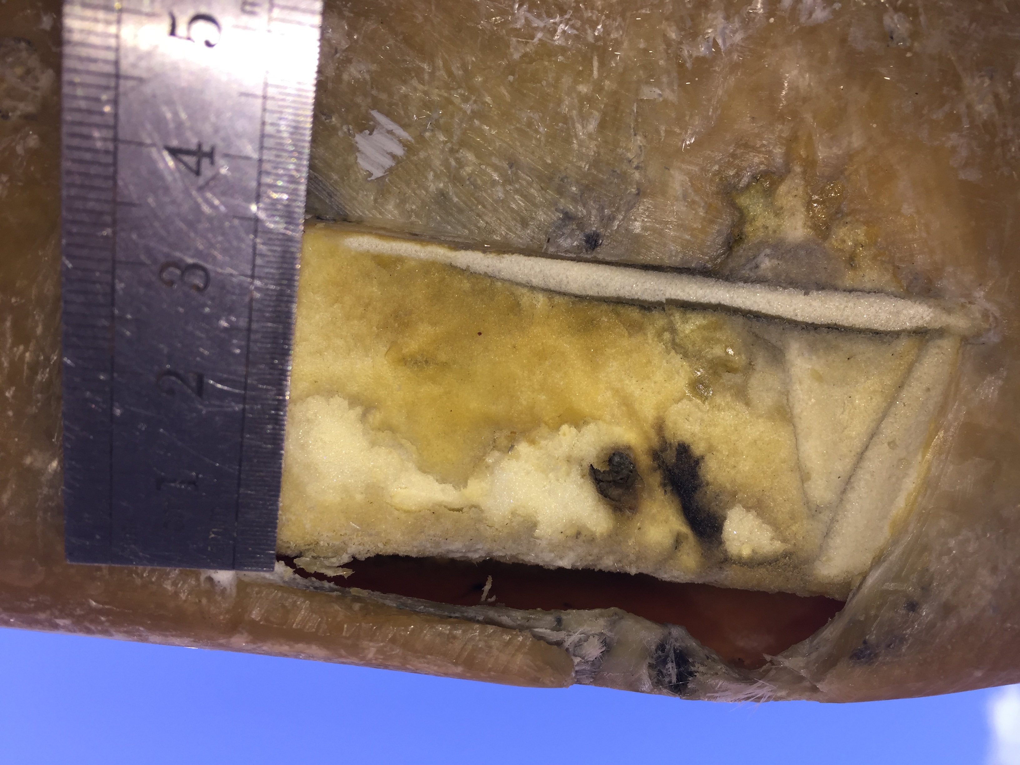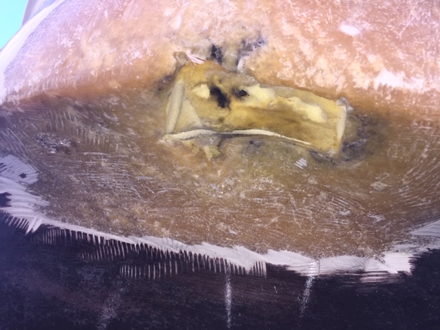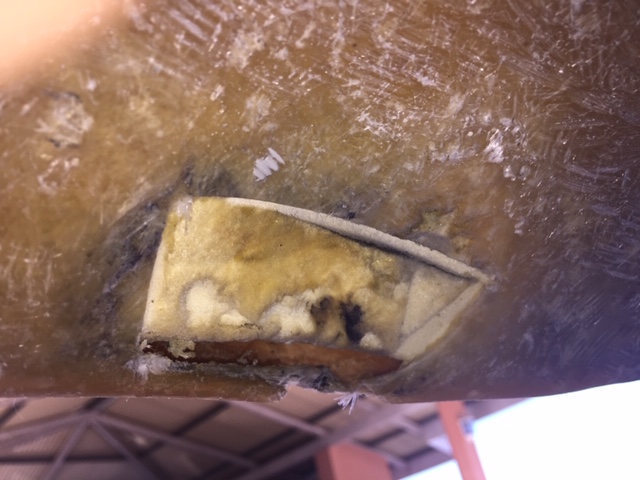Bonjour proprietaire d un quicksilver 505 commander depuis 1 an et demi le bateau est sur remorque et je le sors apres chaque sortie dernierement je me suis appercu qu il y avait de l eau qui suintait de dessous la coque du cote droit .Apres avoir decape l antifouling je me suis rendu compte qu il y avait une reparation effectuee a cet endroit .J ai ponce retire du mastic qui etait mou et dessous il y avait un enfoncemet avec la fibre cassee.J ai enlever toute la fibre deterioree jusqu a la mousse .